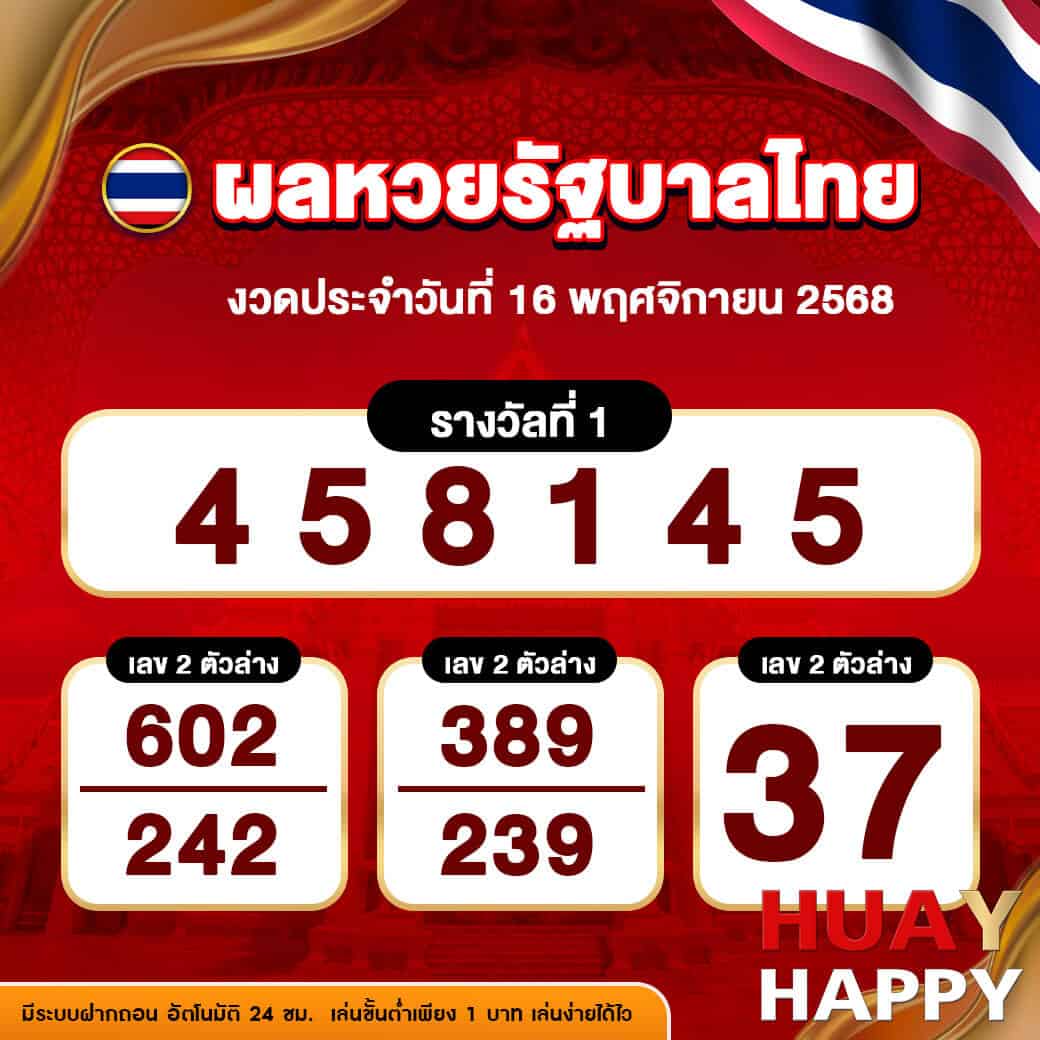 ผลหวยไทยงวดล่าสุด ประจำวันที่ 16 พฤศจิกายน 2568 ผลการออกรางวัลที่สำคัญมีดังนี้