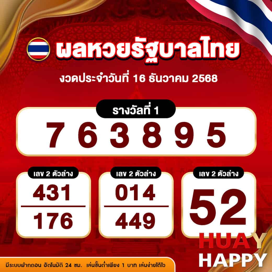ผลหวยไทยงวดล่าสุด ประจำวันที่ 16 ธันวาคม 2568 ผลการออกรางวัลที่สำคัญมีดังนี้