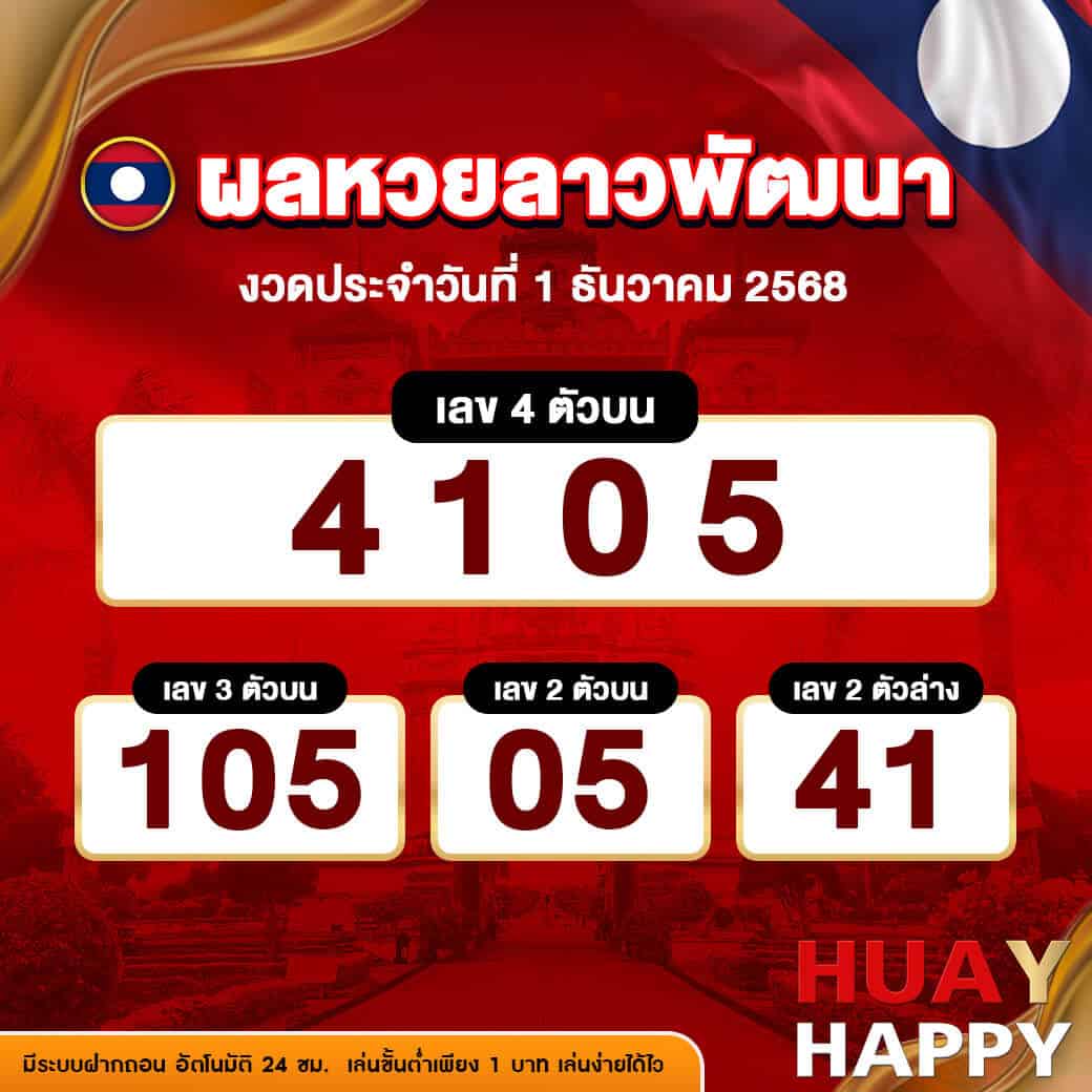 ผลหวยลาวพัฒนางวดล่าสุด ประจำวันที่ 1 ธันวาคม 2568 ผลการออกรางวัลที่สำคัญ มีดังนี้