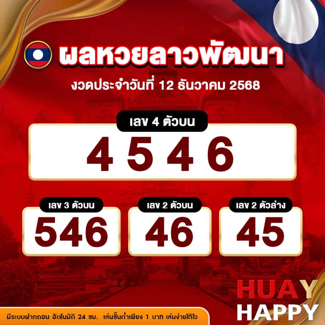 ผลหวยลาวพัฒนางวดล่าสุด ประจำวันที่ 12 ธันวาคม 2568 ผลการออกรางวัลที่สำคัญ มีดังนี้