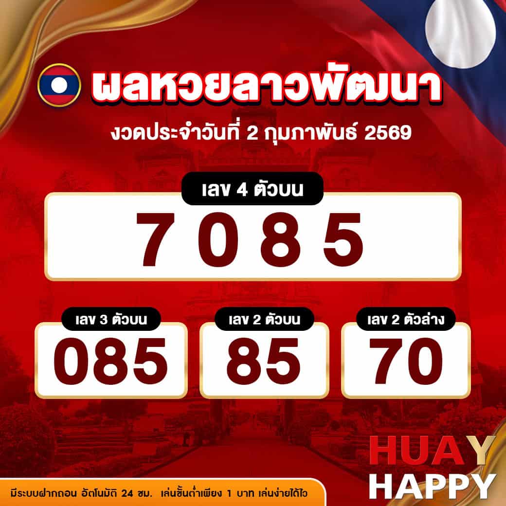 ผลหวยลาวพัฒนางวดล่าสุด ประจำวันที่ 2 กุมภาพันธ์ 2569 ผลการออกรางวัลที่สำคัญ มีดังนี้