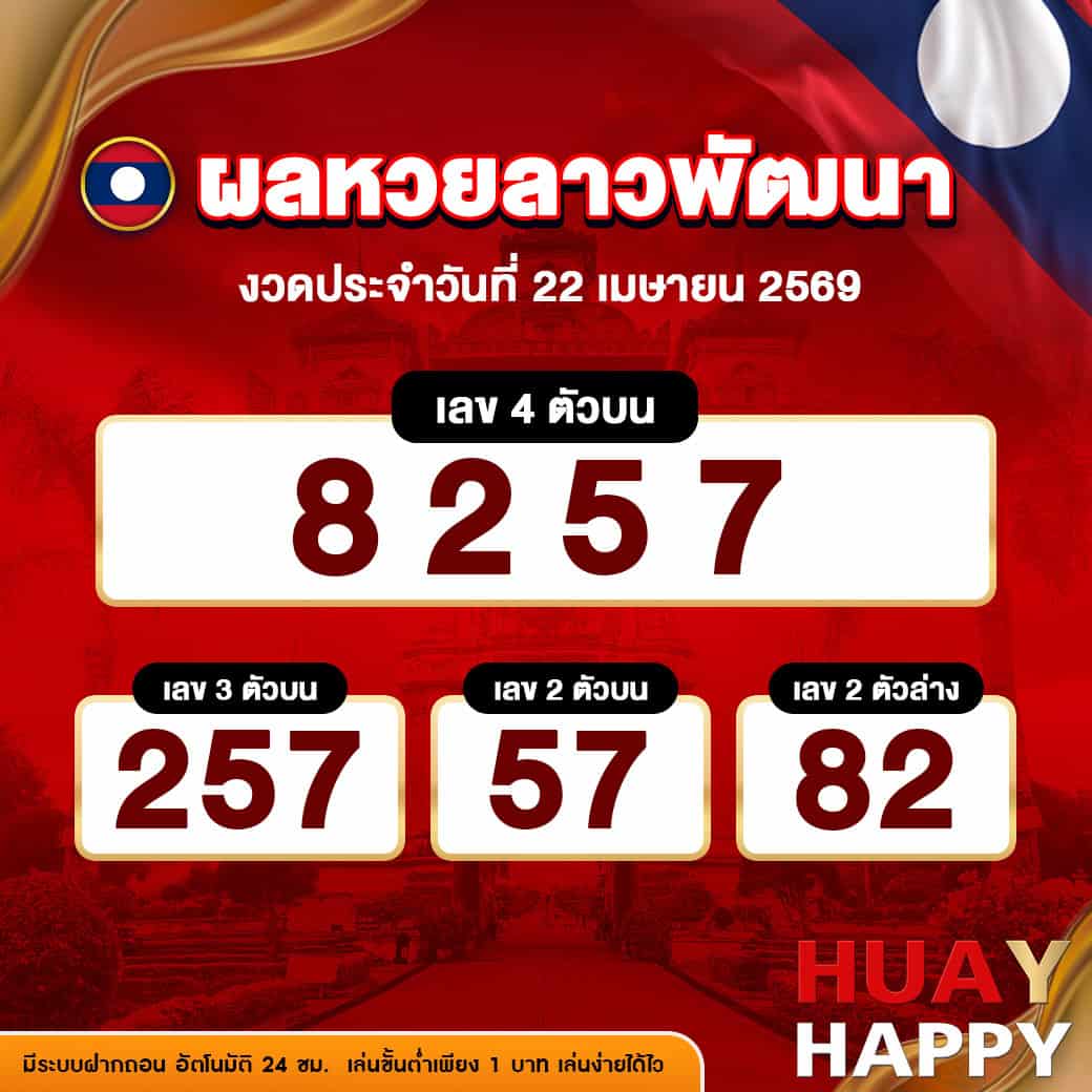 ผลหวยลาวพัฒนางวดล่าสุด ประจำวันที่ 22 เมษายน 2569 ผลการออกรางวัลที่สำคัญ มีดังนี้