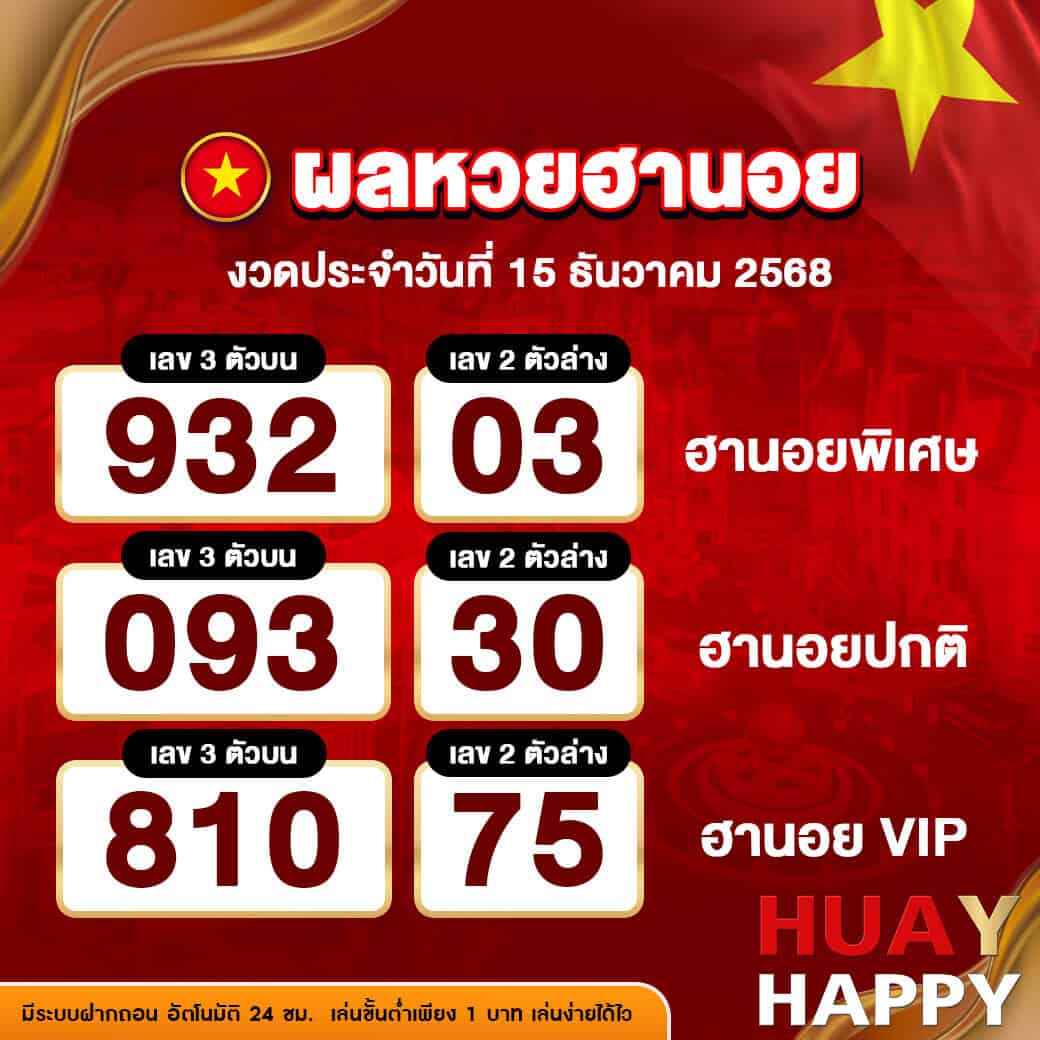 ผลหวยฮานอย งวดวันที่ 15 ธันวาคม 2568