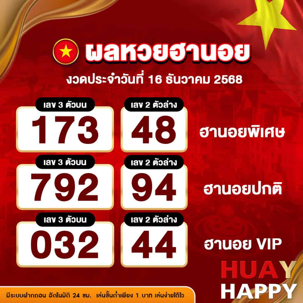 ผลหวยฮานอยงวดล่าสุด ประจำวันที่ 16 ธันวาคม 2568 ผลการออกรางวัลที่สำคัญ มีดังนี้