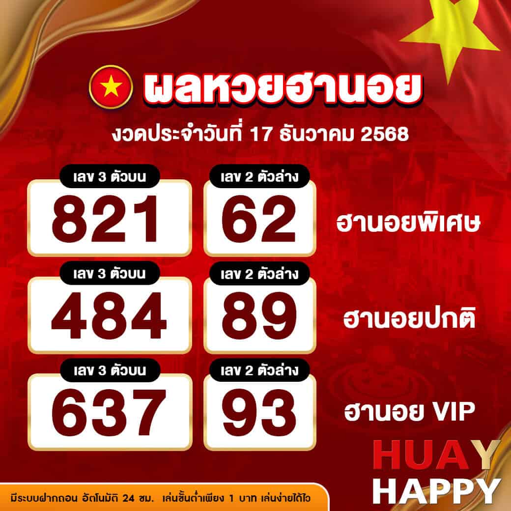 ผลหวยฮานอยงวดล่าสุด ประจำวันที่ 17 ธันวาคม 2568 ผลการออกรางวัลที่สำคัญ มีดังนี้