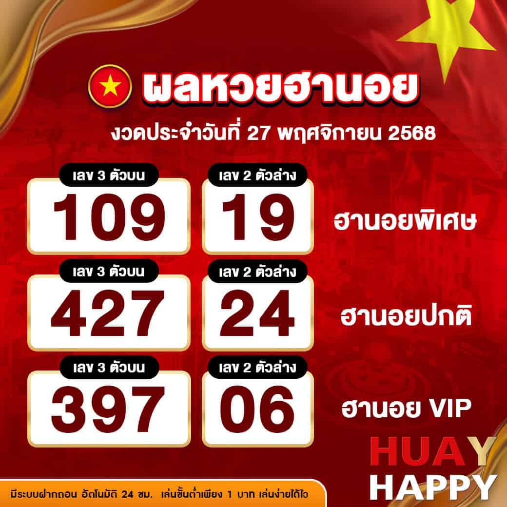 ผลหวยฮานอย งวดวันที่ 27 พฤศจิกายน 2568