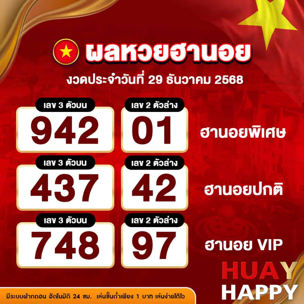 ผลหวยฮานอยงวดล่าสุด ประจำวันที่ 29 ธันวาคม 2568 ผลการออกรางวัลที่สำคัญ มีดังนี้